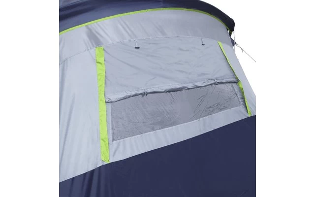 Sechs Fenster (je 50 % Moskitogaze, 50 % Folie) sorgen für ausreichend Licht und Belüftung im Zelt. Moskitogaze im Dach bietet beste Luftzirkulation. Das Zelt kann ohne Überdach aufgestellt werden. Doppelt abgedeckte Reißverschlüsse sorgen für ein dichtes Zelt. In der Mitte befindet sich eine Lampenanbringung. Die Türen der fest integrierten Schlafkabinen können blickdicht verschlossen werden und verfügen zusätzlich über eine Moskitogazetür. Die komfortable Stehhöhe beträgt 218 cm.