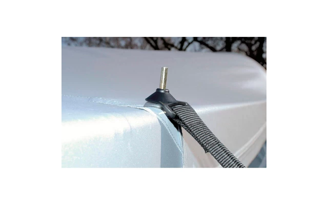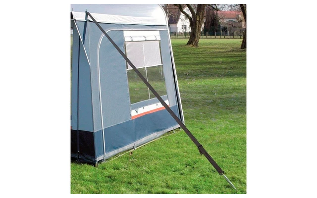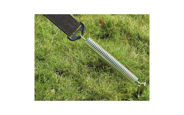 Herkömmliche, über dem Zelt liegende Sturmgurte können durch Scheuerndas Dachgewebe beschädigen. Fest angenähte Sturmsicherungen können die Naht- und Gewebebereiche unnötig belasten.Das Sturmsicherungspaket Mistral hingegen sichert das Vorzelt am Gestängedornder Eckwinkel, einem der stabilsten Punkte eines Vorzeltes. Die Abspannung erfolgt mit schweren Gewebegurtenund robusten Ankerheringen. Eine dazwischen gesetzte Stahl-Spiralfeder gleicht durch Windböen hervorgerufene Reiß- und Zugkräfte aus.