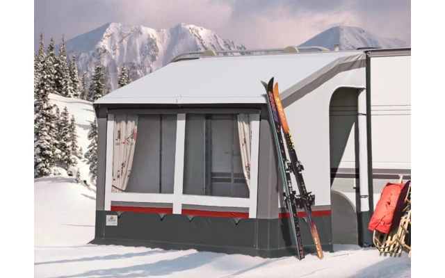 Der Name spricht für sich: mit diesem Teilzelt sind Sie für den Winterurlaub auch in alpinen Regionen bestens gerüstet. Die „Knickdach-Technik“ gewährleistet einen optimalen Ablauf von Schmelzwasser. Das Vordach verhindert ein Ablaufen des Wassers an der Vorderwand. Das 28 mm Stahlgestänge bietet die notwendige Stabilität. Die Reißverschlüsse an beiden Eingangstüren („Stalltür“ – Öffnung möglich) sind abgedeckt. Die Vorderwand ist herausnehmbar und kann bei Bedarf zu einer Veranda abgeklappt werden.