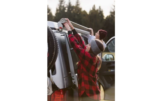 Die praktische, manuell zu tätigende Fiamma F35 pro mit integrierten Stützfüßen in der Walze, welche dank der verschiedenen Halterungen (auf Anfrage) and die Fahrzeugwand, Dachträger oder Schiene jeglicher Minivans angebracht werden kann.