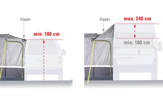 4 neongelbe, verstellbare Sturmbänder und Abspannleinen sind in der Dämmerung gut sichtbar. Die Schleuse hat eine Dach-Befestigungslänge von 245 cm und eine verstellbare Anbauhöhe von 180-240 cm mittels Reißverschlusses und verstellbarem Gurtband. 2 Schleusentüren ermöglichen den Zugang zum Fahrzeug. Das praktische „Drive Away Zip System“ ermöglicht ein leichtes Fahrzeug An- und Abdocken. Das Zelt ist mit einer Keder-Reißverschlussleiste ausgerüstet. Keder in die Kederschiene am Fahrzeug einziehen und mittels Reißverschluss verbinden. Die Schleuse ist komplett aufrollbar. Flexible Befestigung am Fahrzeug. 1- Hohlsaum Schleusenstab mit Klemmen oder Abspannleinen.